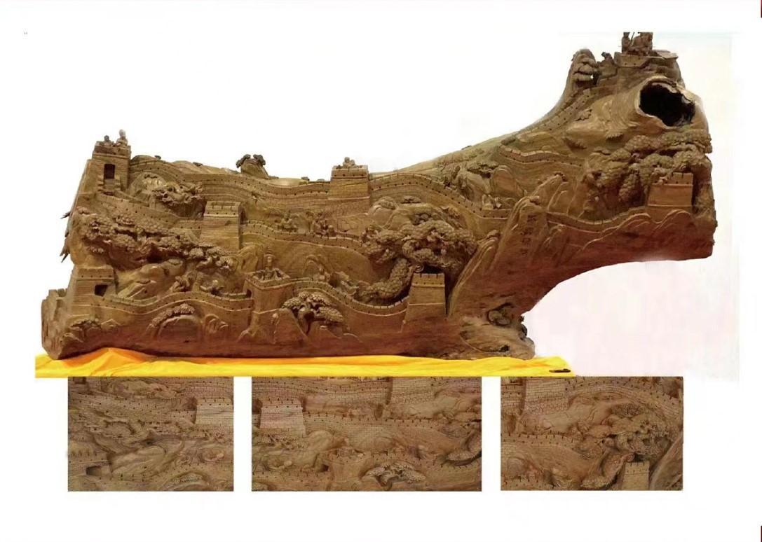 《一统江山·长城固原》木雕以一字型百年香樟木为主线,经过精细雕刻而成的独一无二的佳作。