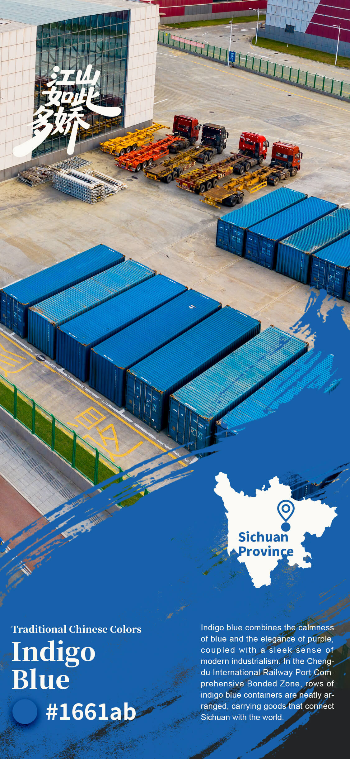 Indigo blue combines the calmness of blue and the elegance of purple, coupled with a sleek sense of modern industrialism. In the Chengdu International Railway Port Comprehensive Bonded Zone, rows of indigo blue containers are neatly arranged, carrying goods that connect Sichuan with the world.