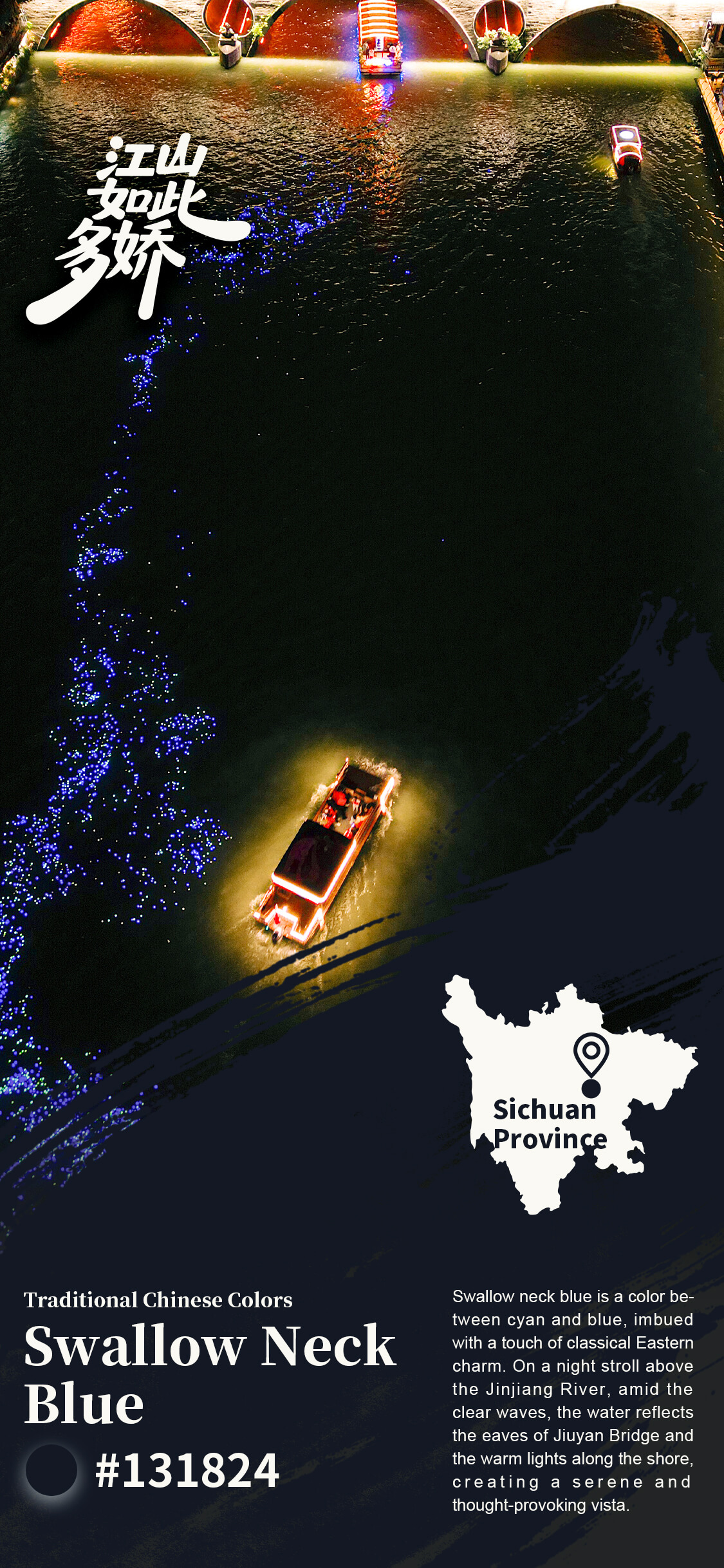 Swallow neck blue is a color between cyan and blue, imbued with a touch of classical Eastern charm. On a night stroll above the Jinjiang River, amid the clear waves, the water reflects the eaves of Jiuyan Bridge and the warm lights along the shore, creating a serene and thought-provoking vista.