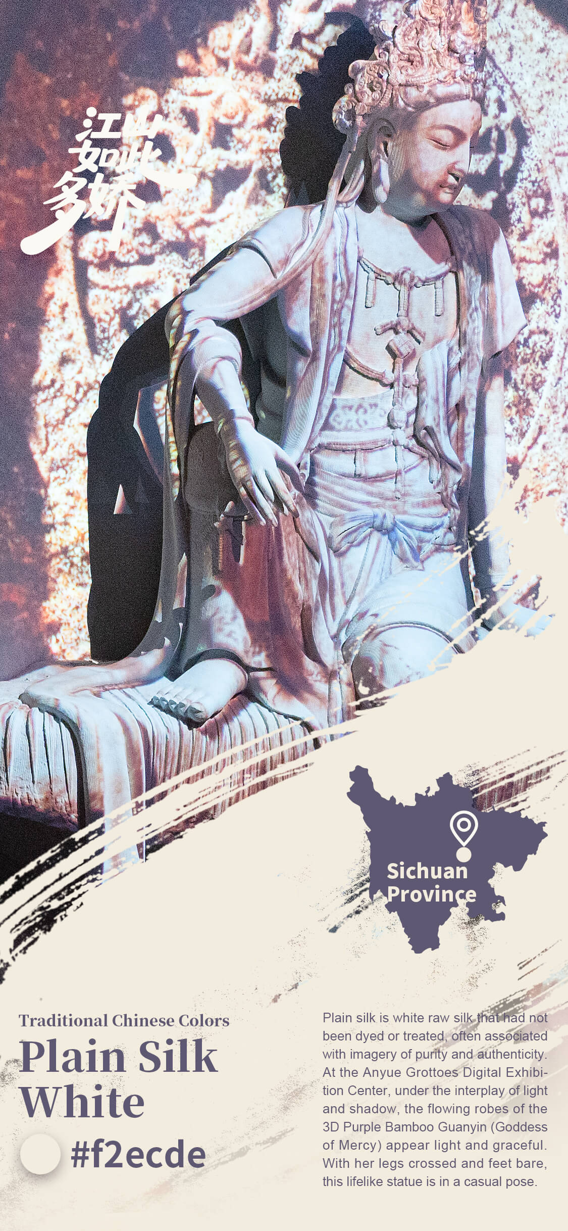 Plain silk is white raw silk that had not been dyed or treated, often associated with imagery of purity and authenticity. At the Anyue Grottoes Digital Exhibition Center, under the interplay of light and shadow, the flowing robes of the 3D Purple Bamboo Guanyin (Goddess of Mercy) appear light and graceful. With her legs crossed and feet bare, this lifelike statue is in a casual pose.