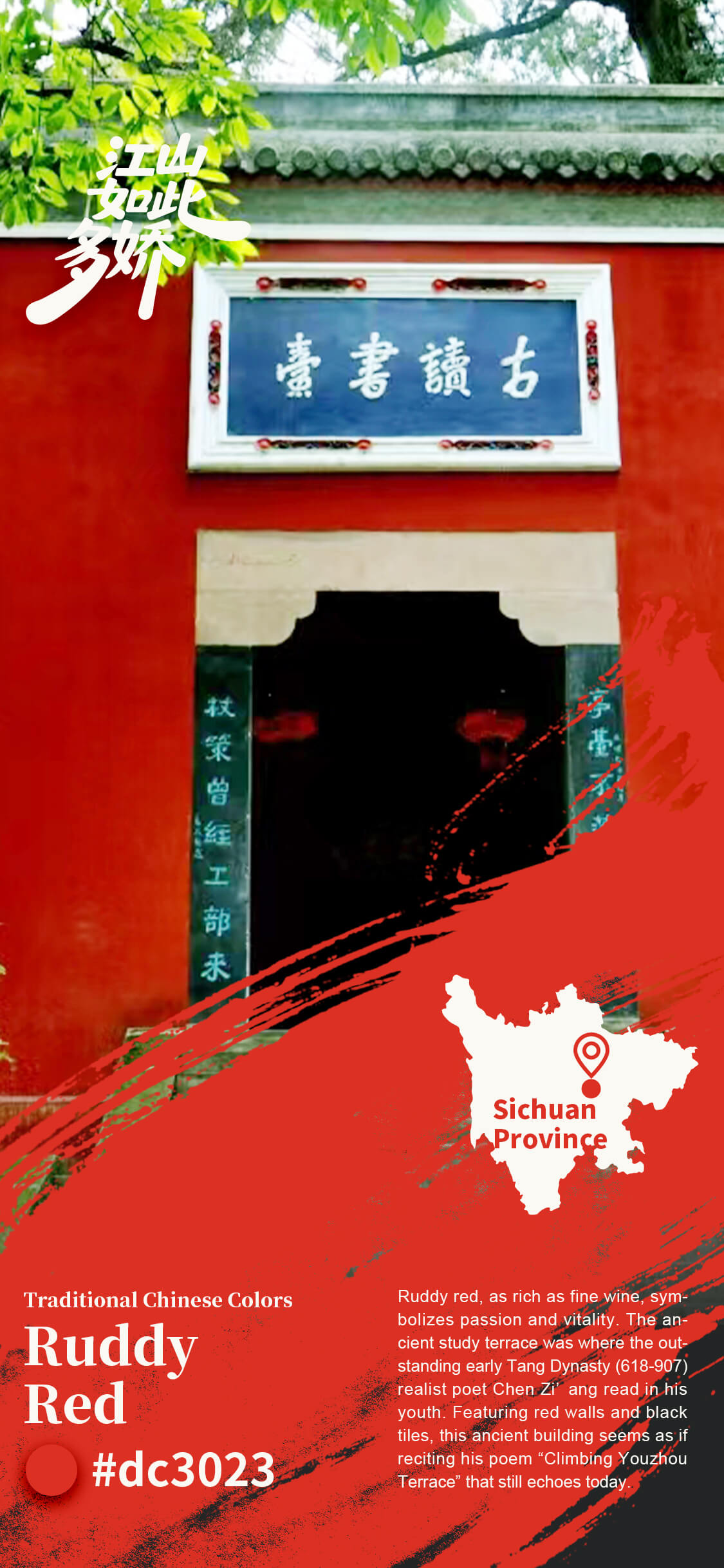Ruddy red, as rich as fine wine, symbolizes passion and vitality. The ancient study terrace was where the outstanding early Tang Dynasty (618-907) realist poet Chen Zi’ang read in his youth. Featuring red walls and black tiles, this ancient building seems as if reciting his poem“Climbing Youzhou Terrace” that still echoes today.